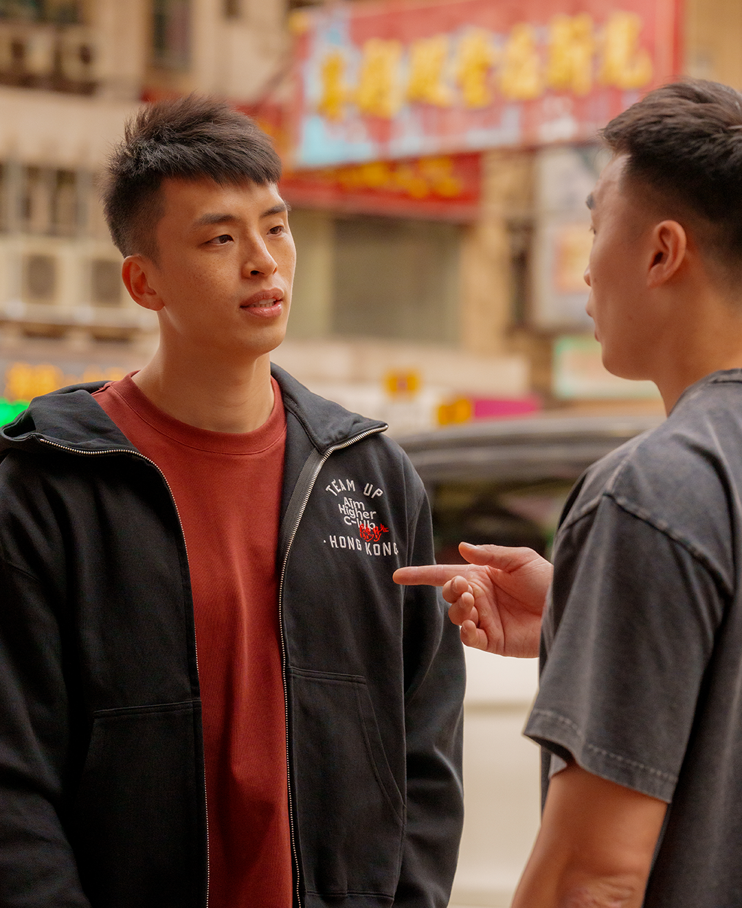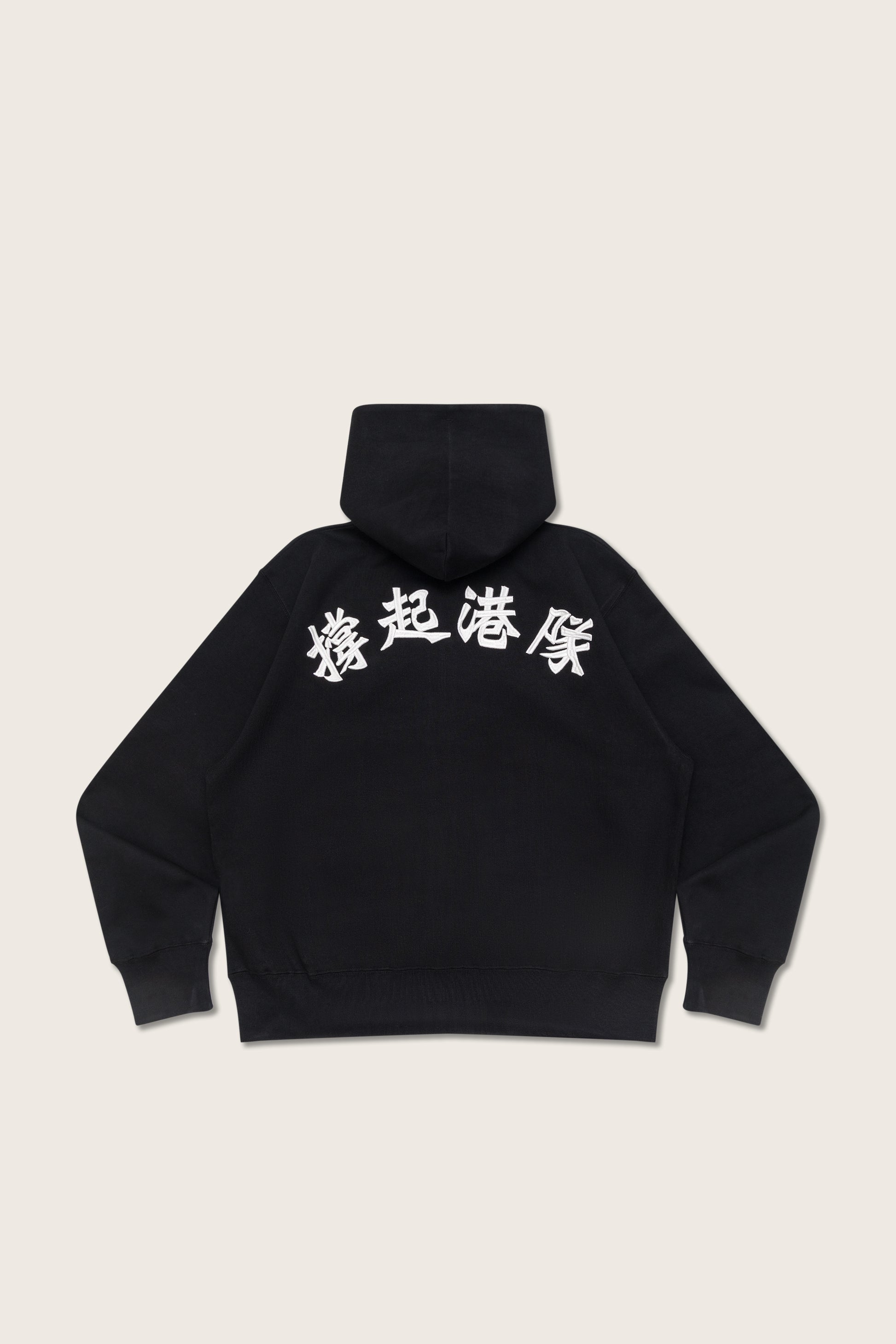 拉鏈有帽外套:黑色立體突字刺繡 採用 400g 厚磅布料,保暖而舒適。後幅以極立體突字呈現「撐起港隊」,視覺質感明顯提升;胸前則以 TEAM UP HONG KONG × AHC 字樣作點綴,簡潔耐看。